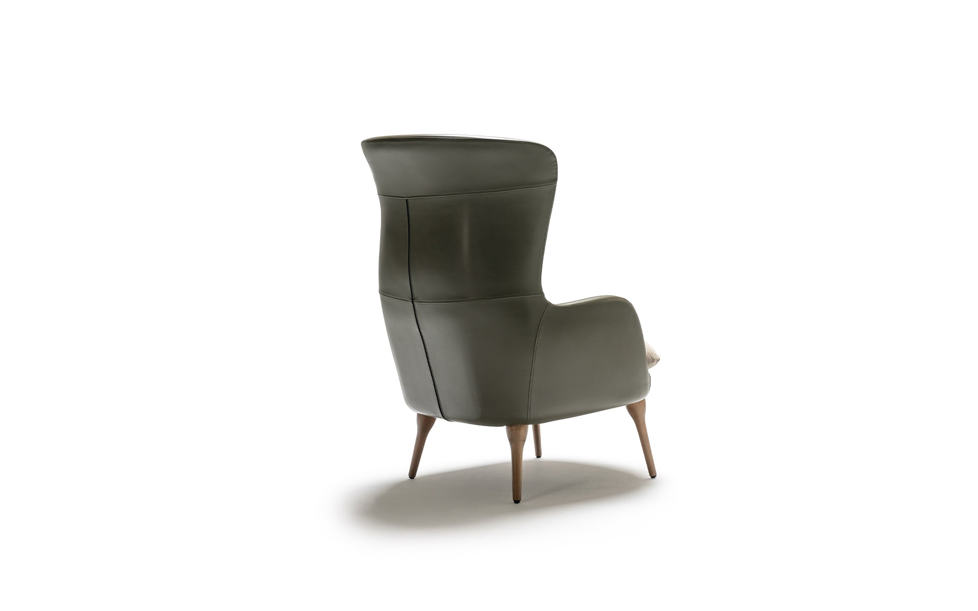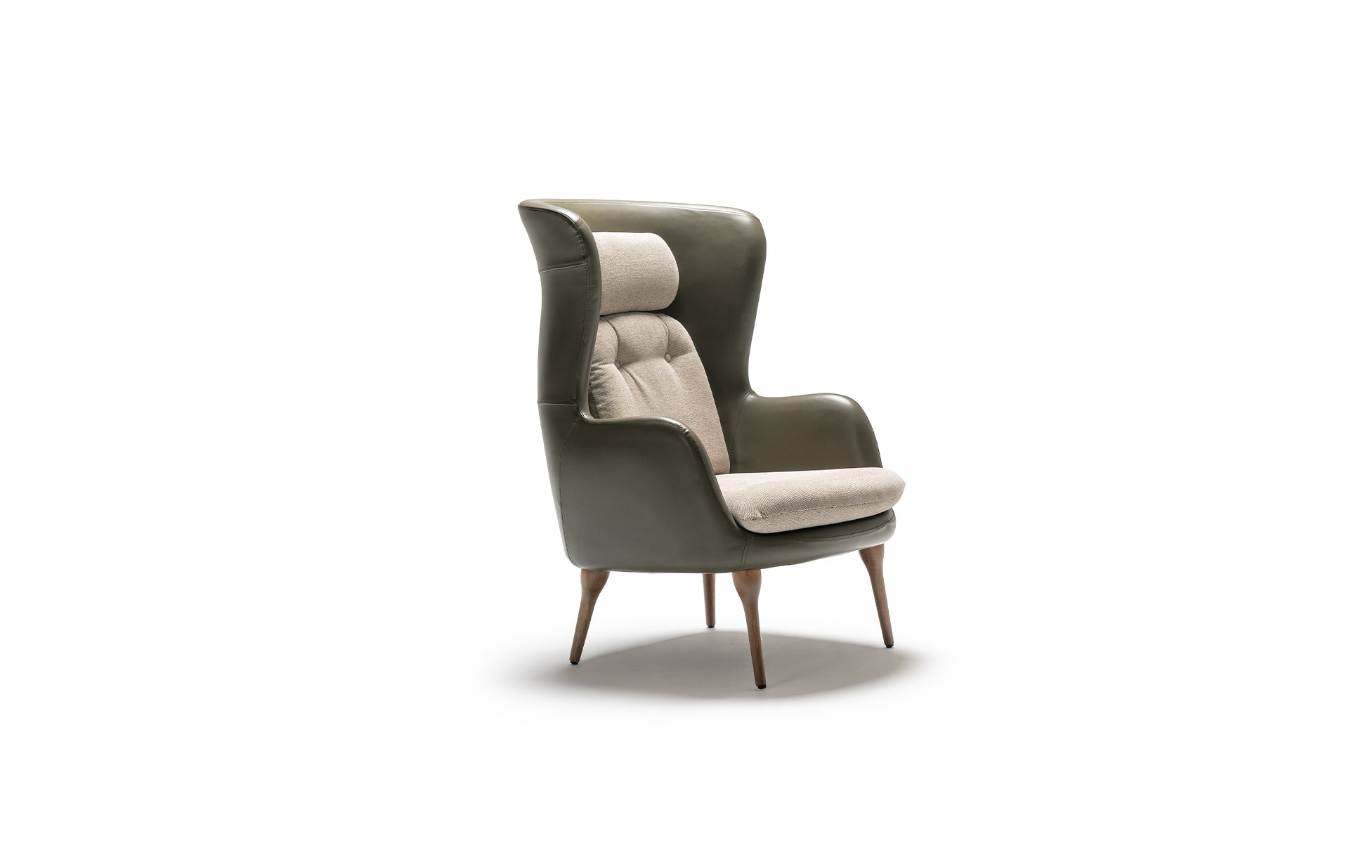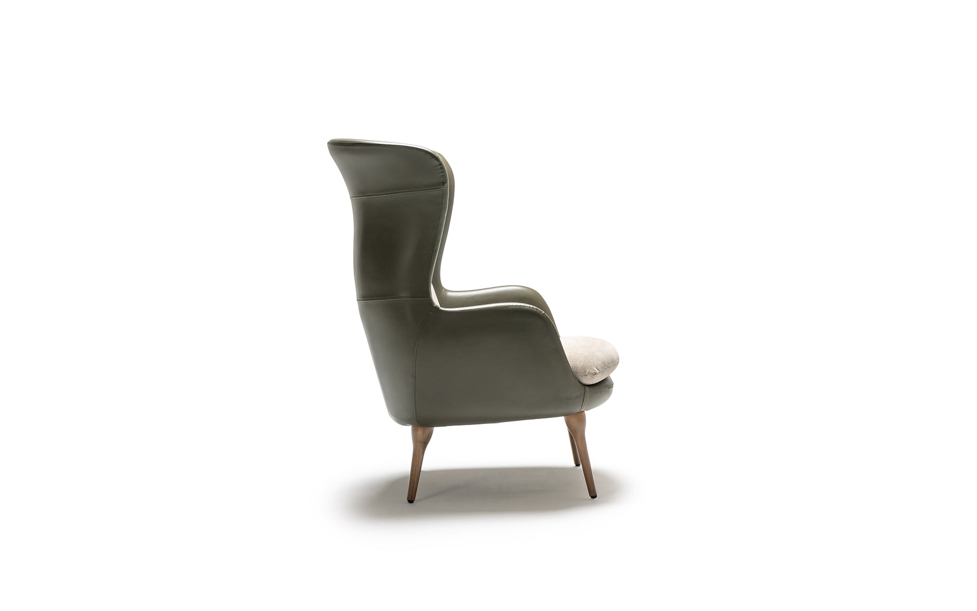 Its tall, enveloping backrest offers exceptional support, while the refined curves and contrasting upholstery bring depth and visual harmony.