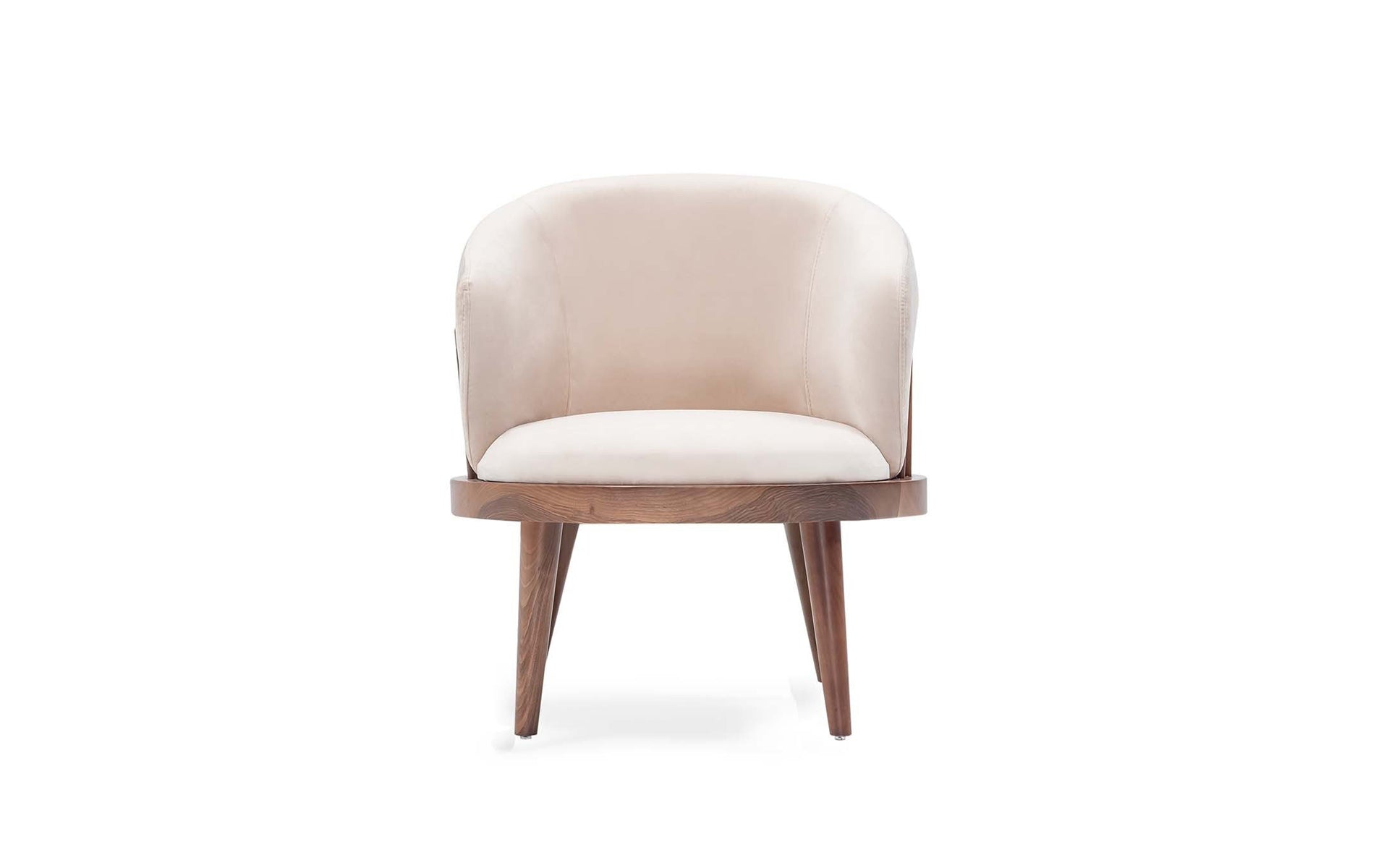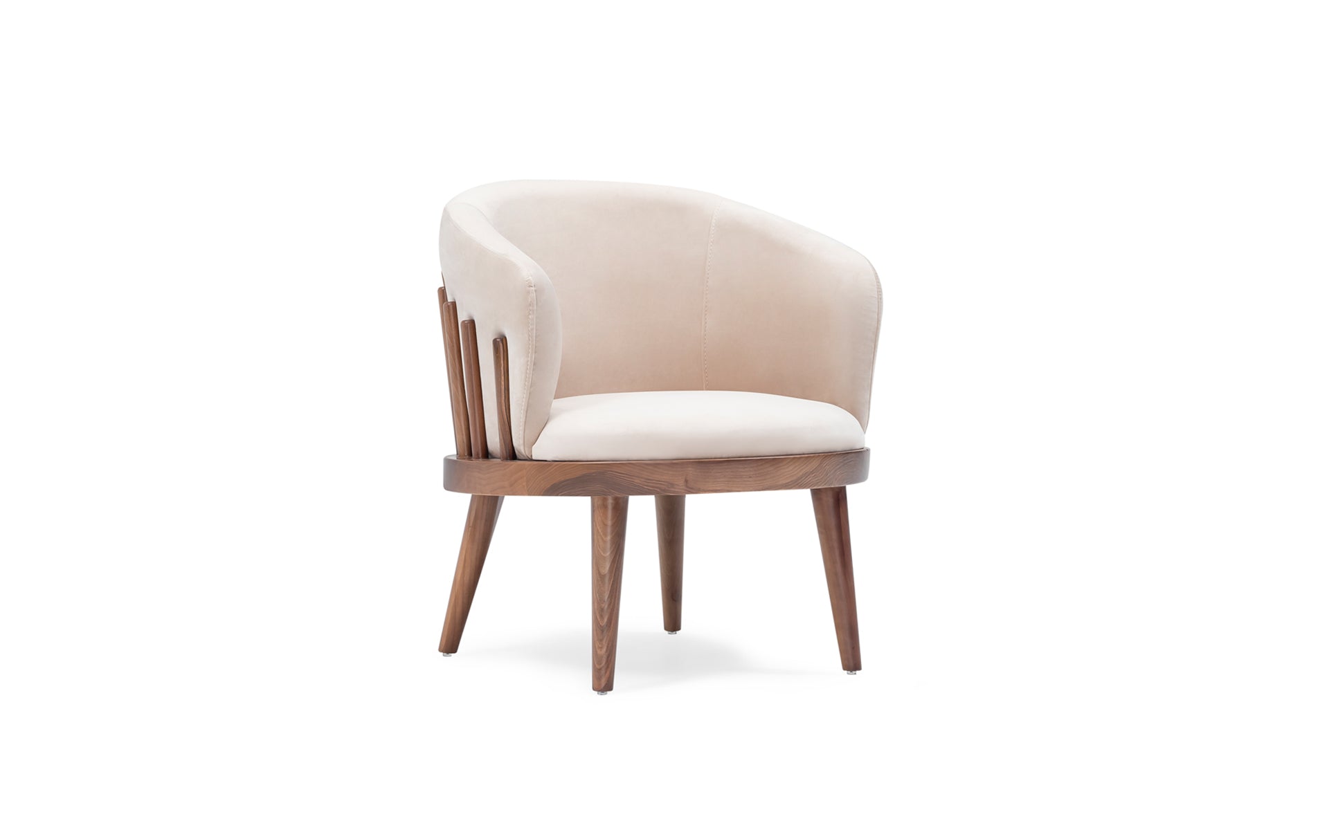 Its soft upholstered form is beautifully framed by a solid wood structure that enhances its craftsmanship and character.