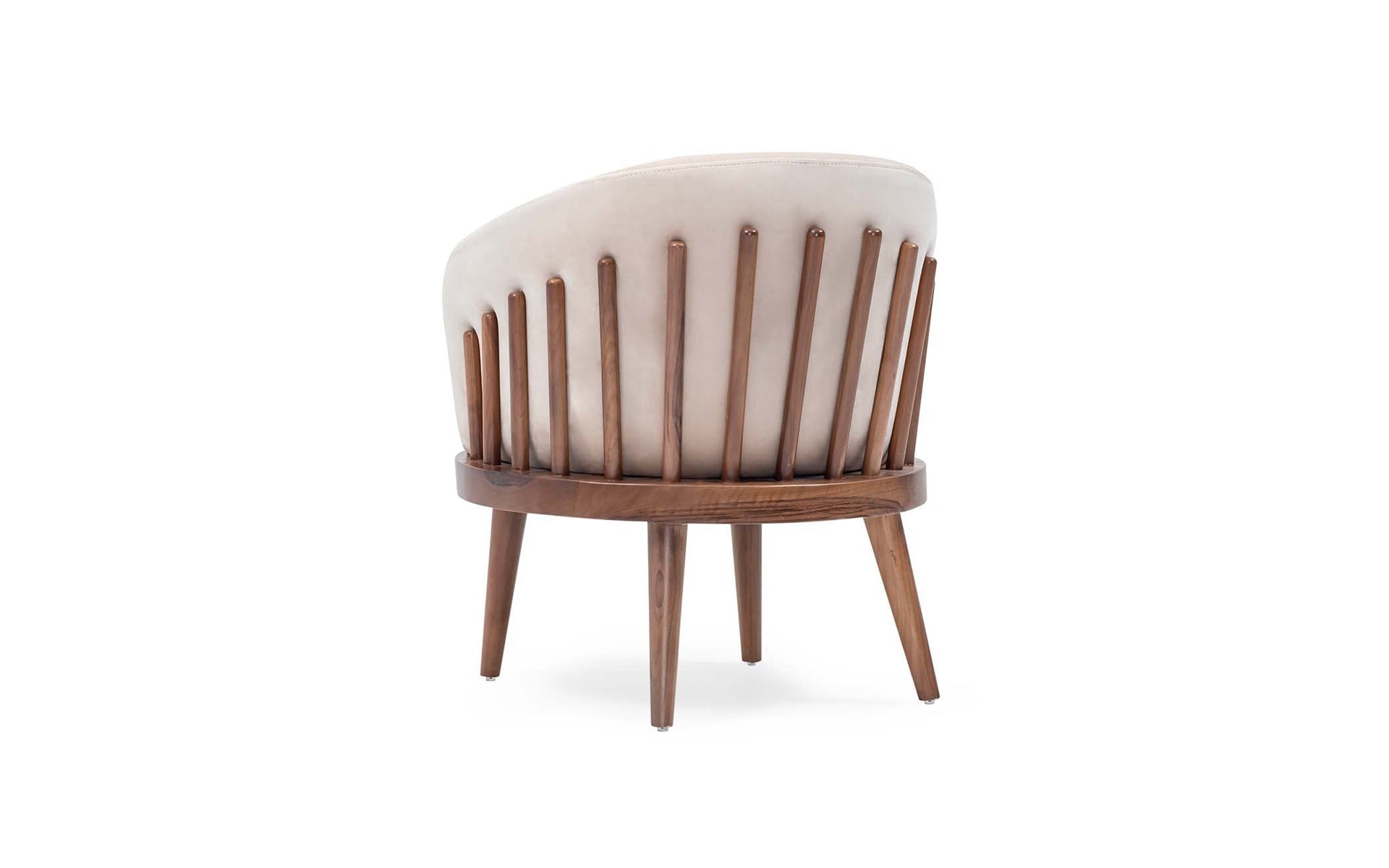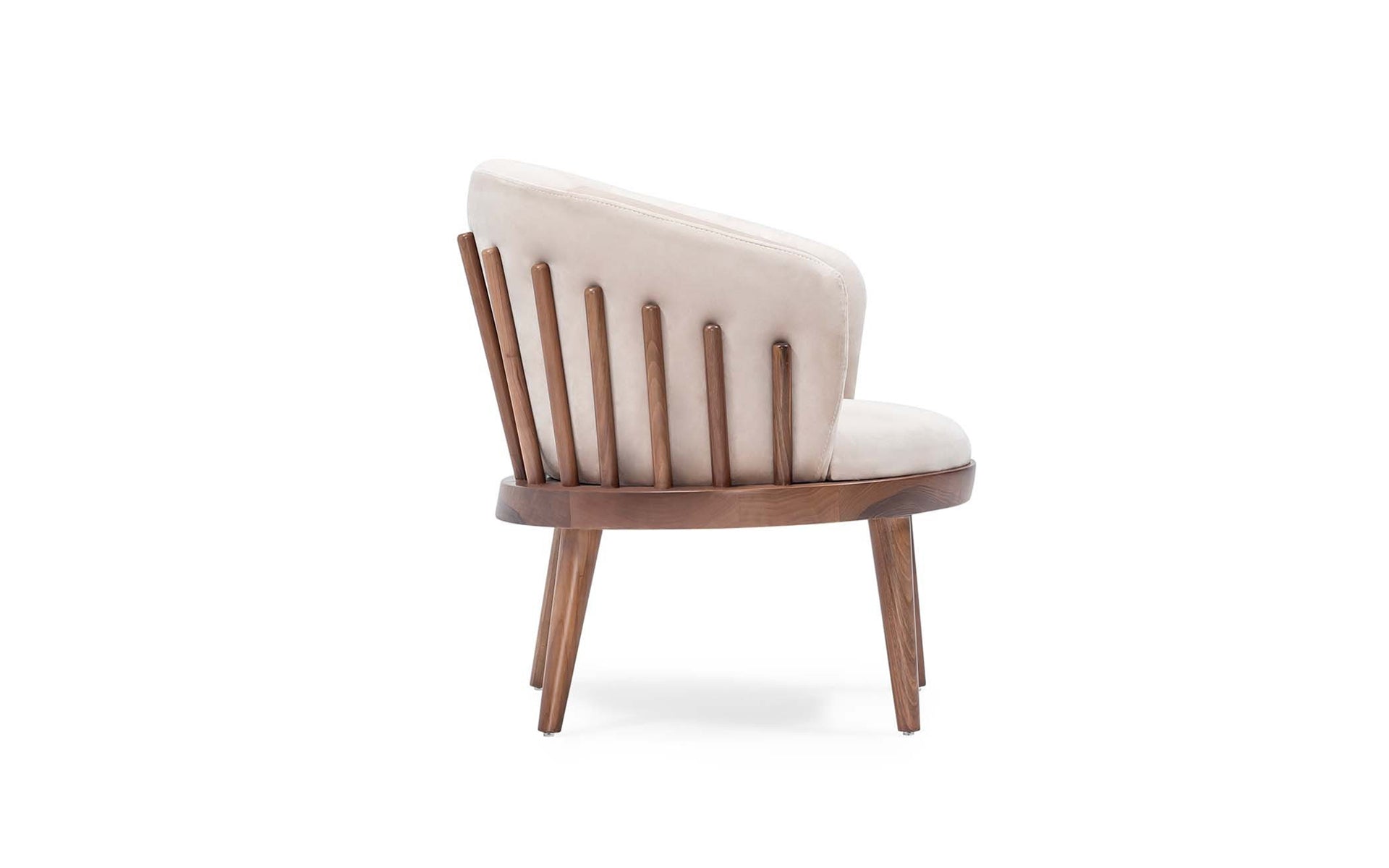The backrest’s vertical wooden detailing adds both strength and a sculptural touch to the overall design.